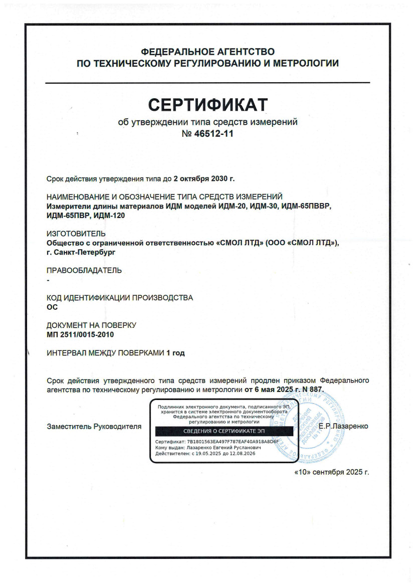 Мы продлили Сертификат на измерители длины материалов ИДМ моделей ИДМ-20, ИДМ-30, ИДМ-65ПВР, ИДМ-65ПВВР, ИДМ-120.